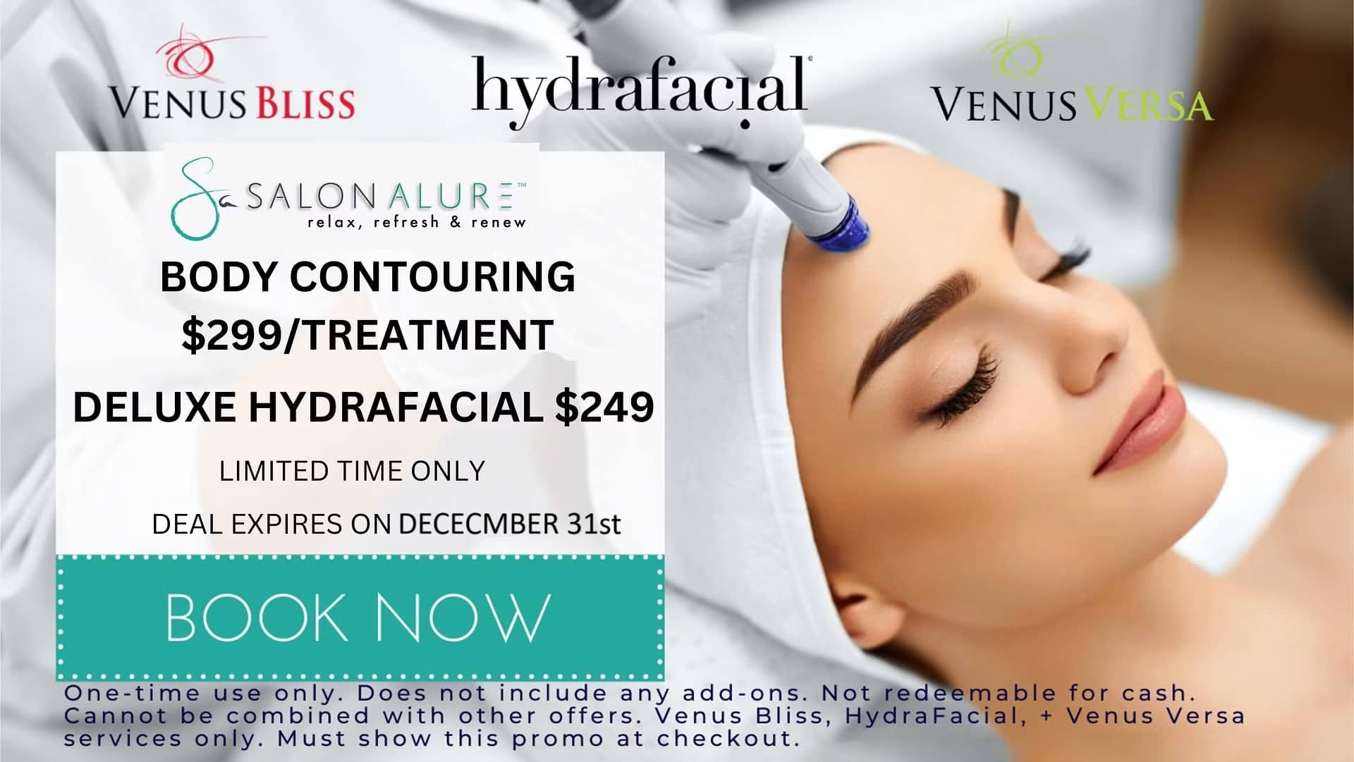 For $1,499, you can purchase the complete series – (1) Venus Bliss Slim and Smooth Body Contouring treatments and (3) Venus Bliss Cellulite Reduction Treatments.